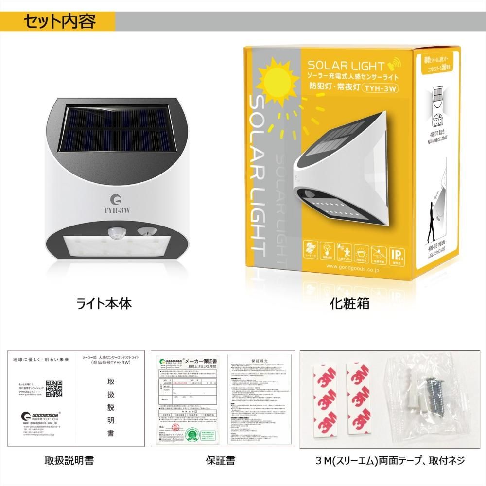 グッドグッズ(GOODGOODS) ソーラー充電式人感センサーライト 自動点灯 常夜灯 コンパクト 取付簡単 玄関灯 防犯 TYH-3W