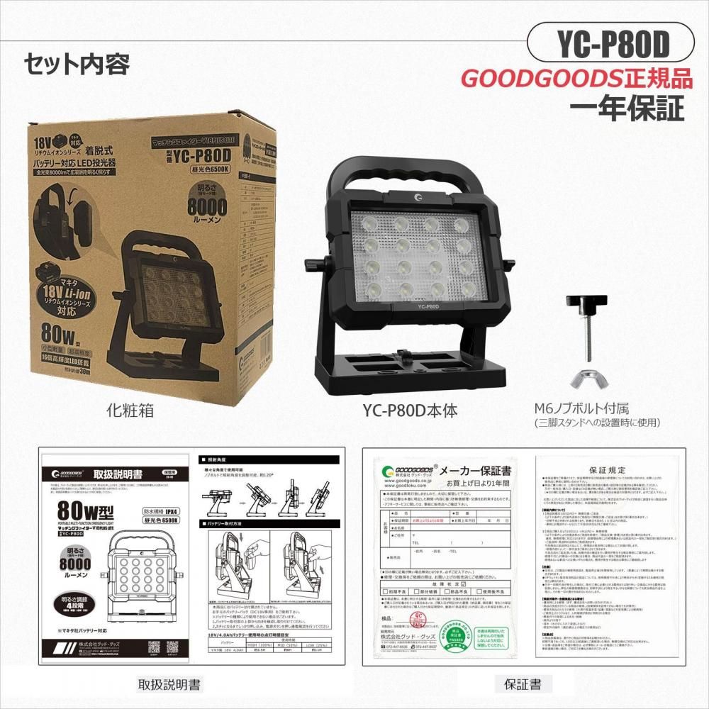 グッド・グッズ(GOODGOODS) LED投光器 80W バッテリー着脱式 作業灯 8000lm マキタ社製18Vバッテリー対応 昼光色 工事 作業 防災 YC-P80D ※バッテリー付属なし